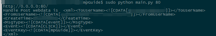 编译好代码后,重新启动服务,(sudo python main.py 80),view类型、media_id类型的本身就很容易实现,现在重点看一下click类型的菜单按钮。