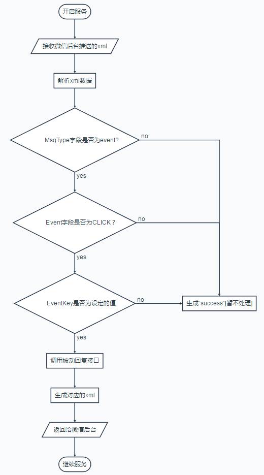 显然,click类型的还需要开发者进一步完善后台代码逻辑,增加对自定义菜单事件推送的响应。