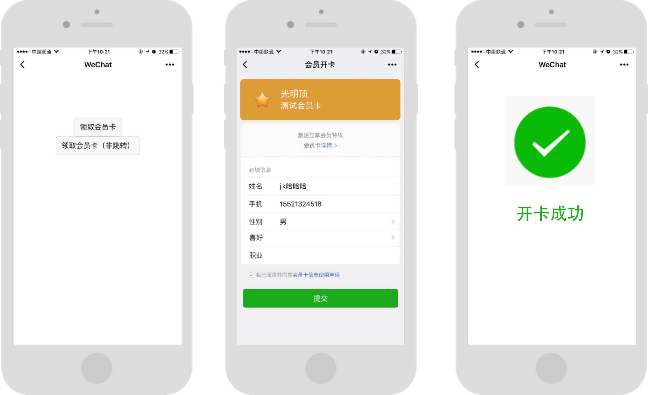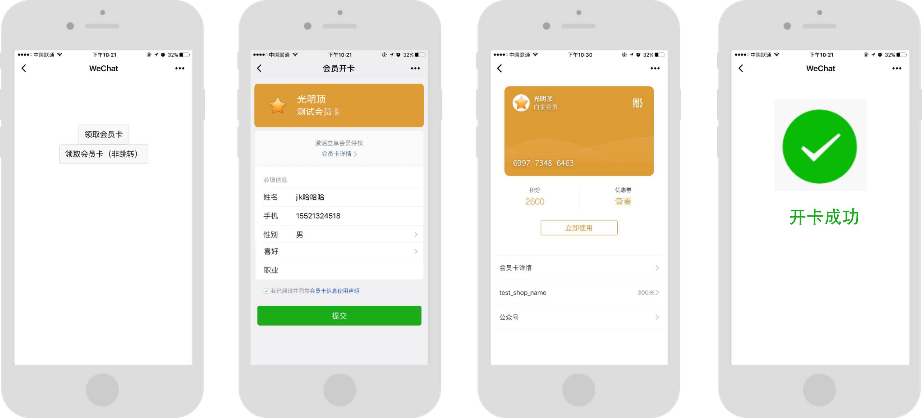 - 获取用户开卡资料并激活用户的会员卡;