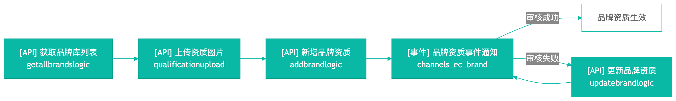file_id - 新增品牌资质:调用 [API] 新增品牌资质 / addbrandlogic,提交品牌资质申请。提交后收到 [事件] 品牌资质事件通知 / channels_ec_brand(