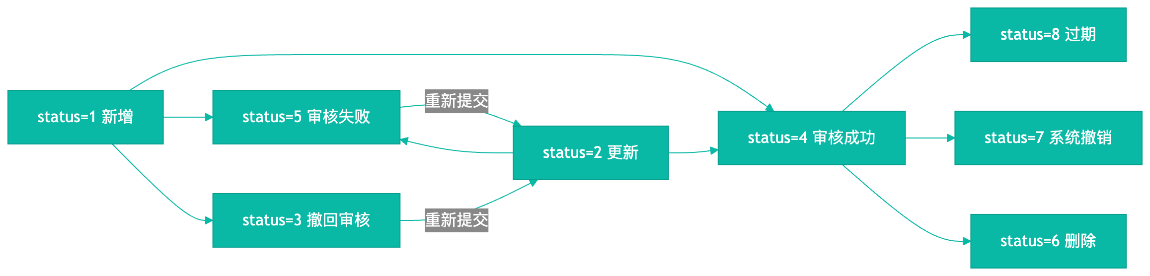 以上流程图体现了 [事件] 品牌资质事件通知 / channels_ec_brand 的全部 8 个状态值。