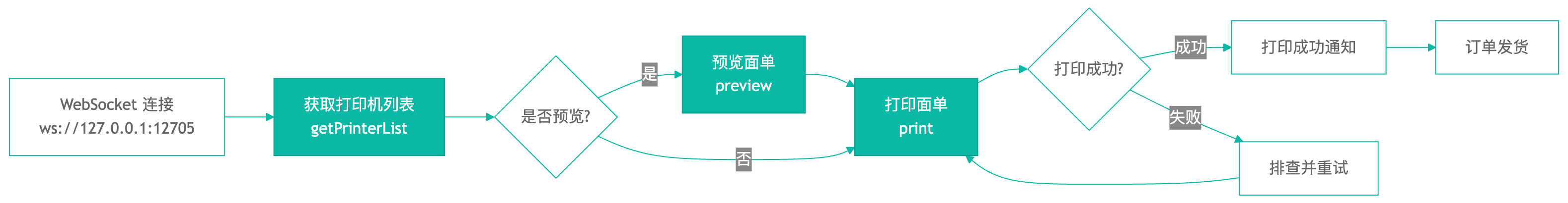 其中前 4 步(连接 → 校验版本 → 获取打印机 → 预览/打印)均通过 WebSocket 指令完成,后 2 步(打印成功通知 → 订单发货)回到服务端 API 调用。下面逐步说明每个指令的用法。