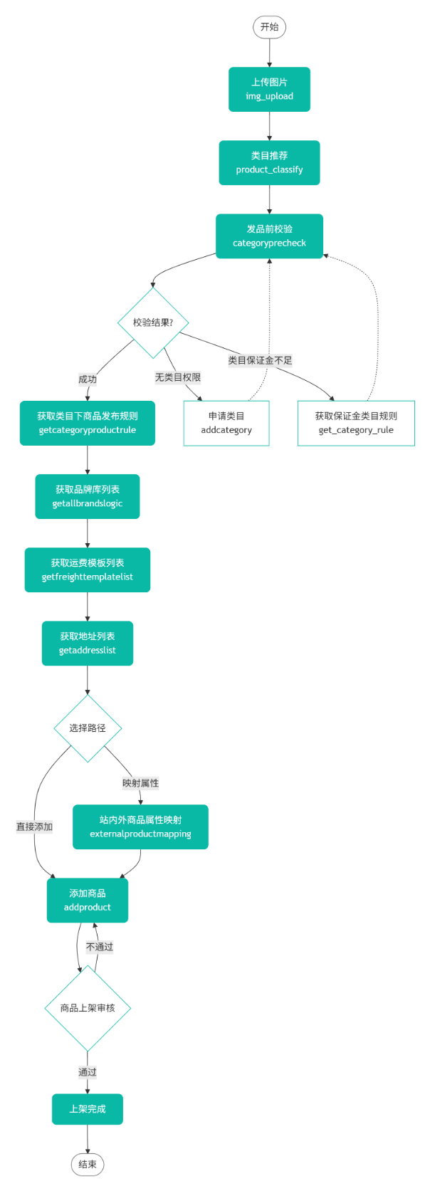 | 4 | 发品前校验 categoryprecheck | cat_id(叶子类目id)release_mode(发布模式) | 获取类目的相关信息 目的:用于在添加商品时填写product_qua_infos、attrs、size_chart等参数及商品编辑要求 |