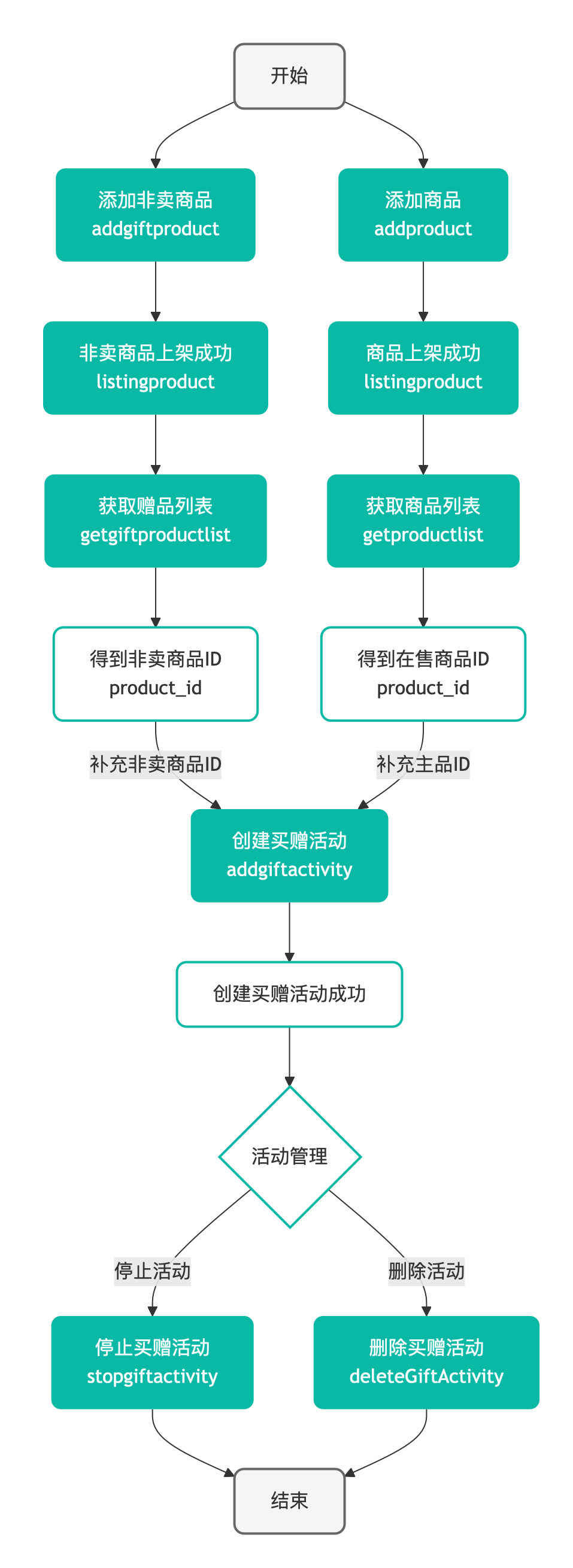 | 创建赠品活动 addgiftactivity | title(活动标题); start_time(活动开始时间); end_time(活动结束时间); detail(活动详情) | 1、通过该接口添加买赠活动; 2、创建买赠活动成功后,返回买赠活动ID,可以用于后续删除或停止买赠活动时填写“activity_id”参数; 3、此前通过添加非卖商品接口创建成功的非卖商品ID(product_id),可用于填写至本接口“gift_set”参数中的“gift_id”; *创建买赠活动中的「gift_id」对应的是添加非卖商品接口中的「product_id」 |