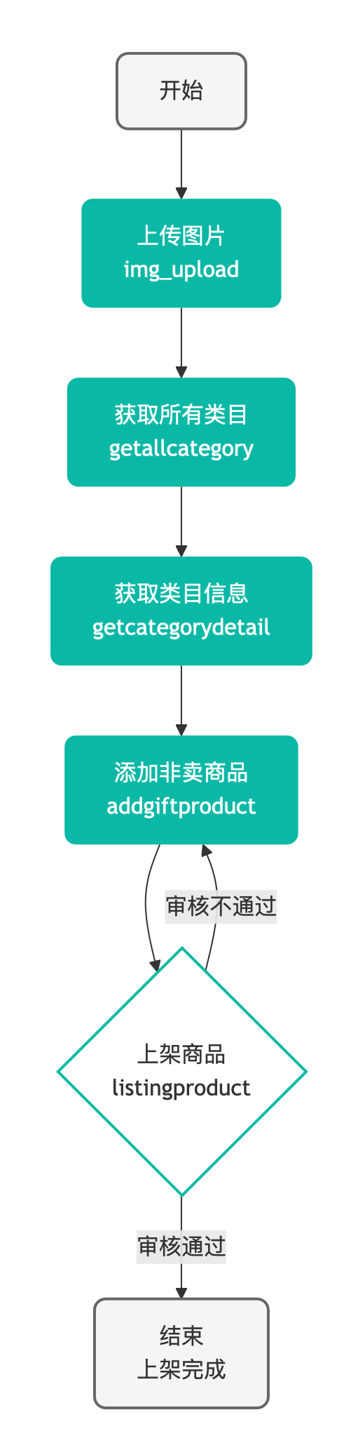 | 添加非卖商品 addgiftproduct | 商品的各级、各字段商品信息,具体参照接口文档参数 | 1、添加非卖商品进入上架审核;2、获得非卖商品创建完成时间。目的:完成非卖商品上架 |