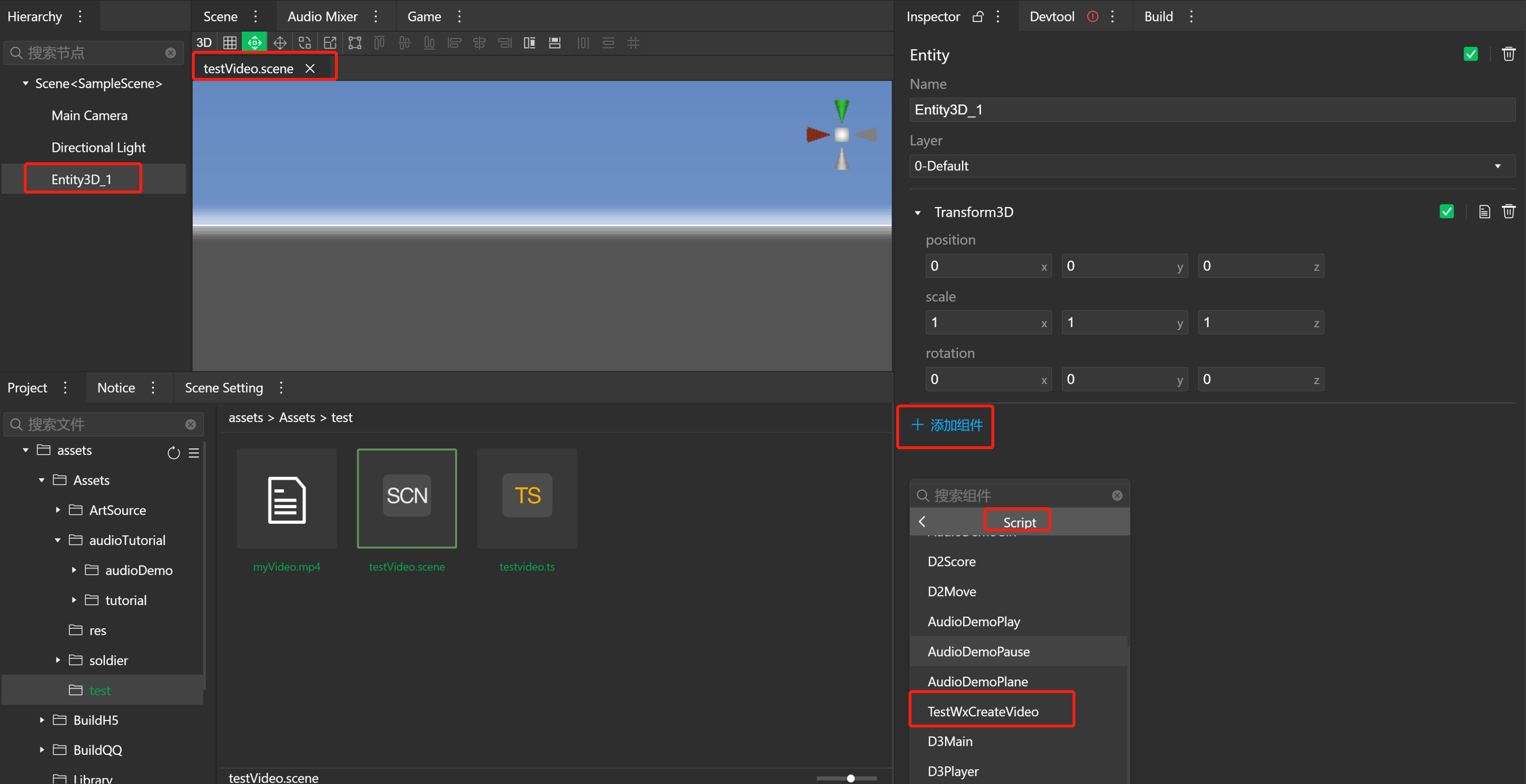 import engine from "engine"; @engine.decorators.serialize("TestWxCreateVideo") export default class TestWxCreateVideo extends engine.Script { public async onAwake() { // 加载视频资源 const videoAsset = await engine.loader.load('Assets/test/myVideo.mp4').promise as engine.RawResource; // 创建视频对象 const video = wx.createVideo({ src: videoAsset.value, // 设置视频资源的src autoplay: true, loop: true, }); } } - 打开3D场景资源,在Hierachy面板创建空节点。然后在Inspector面板配置此空节点,通过Inspector面板底部“+添加组件” -> Script -> TestWxCreateVideo,添加刚创建的脚本资源。按ctrl+s(macOS使用command+s)保存场景。