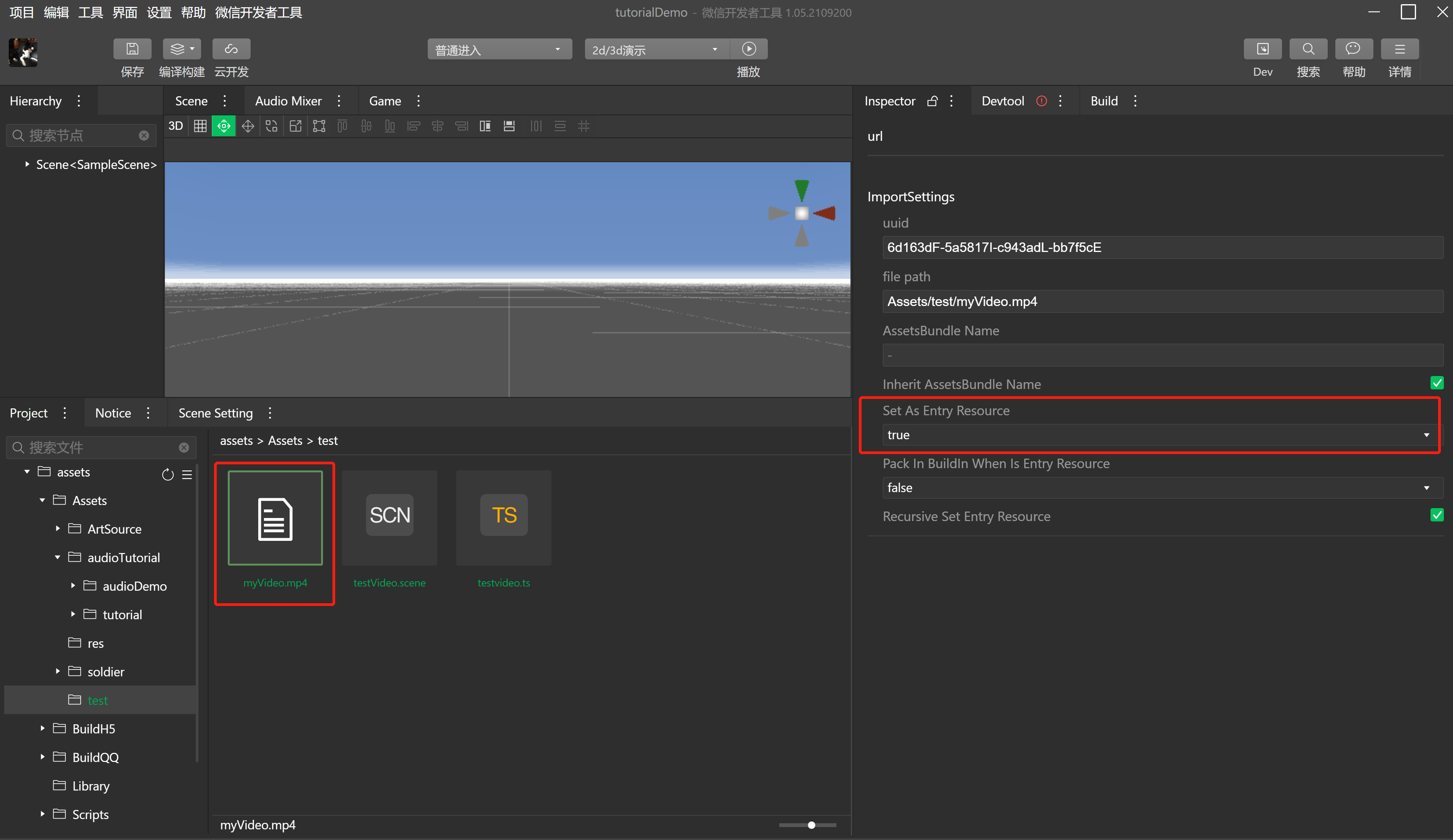 - 在Project面板点击刚导入的视频文件,在Inspector面板将其设置为入口资源,即Set As Entry Resource = true。这样才能通过engine.loader.load接口加载对应的视频资源。
