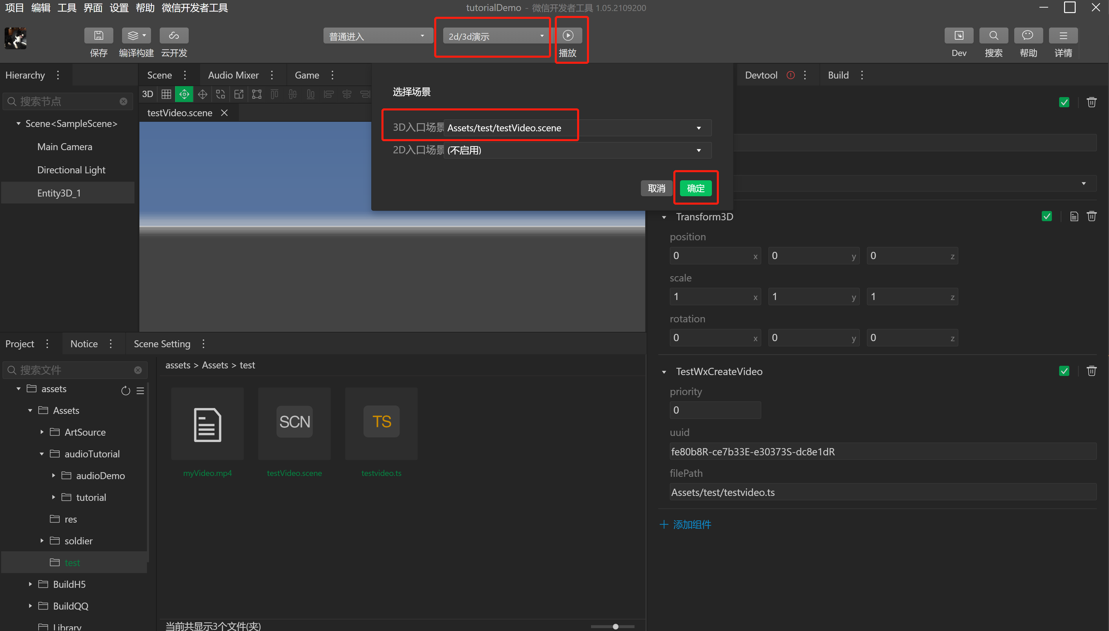- 在工具顶部点击“2d/3d演示”,设置主3D场景,并点击“确认”按钮保存。然后点击工具顶部的“播放”按钮播放场景,即可播放场景,在游戏场景里播放视频。
