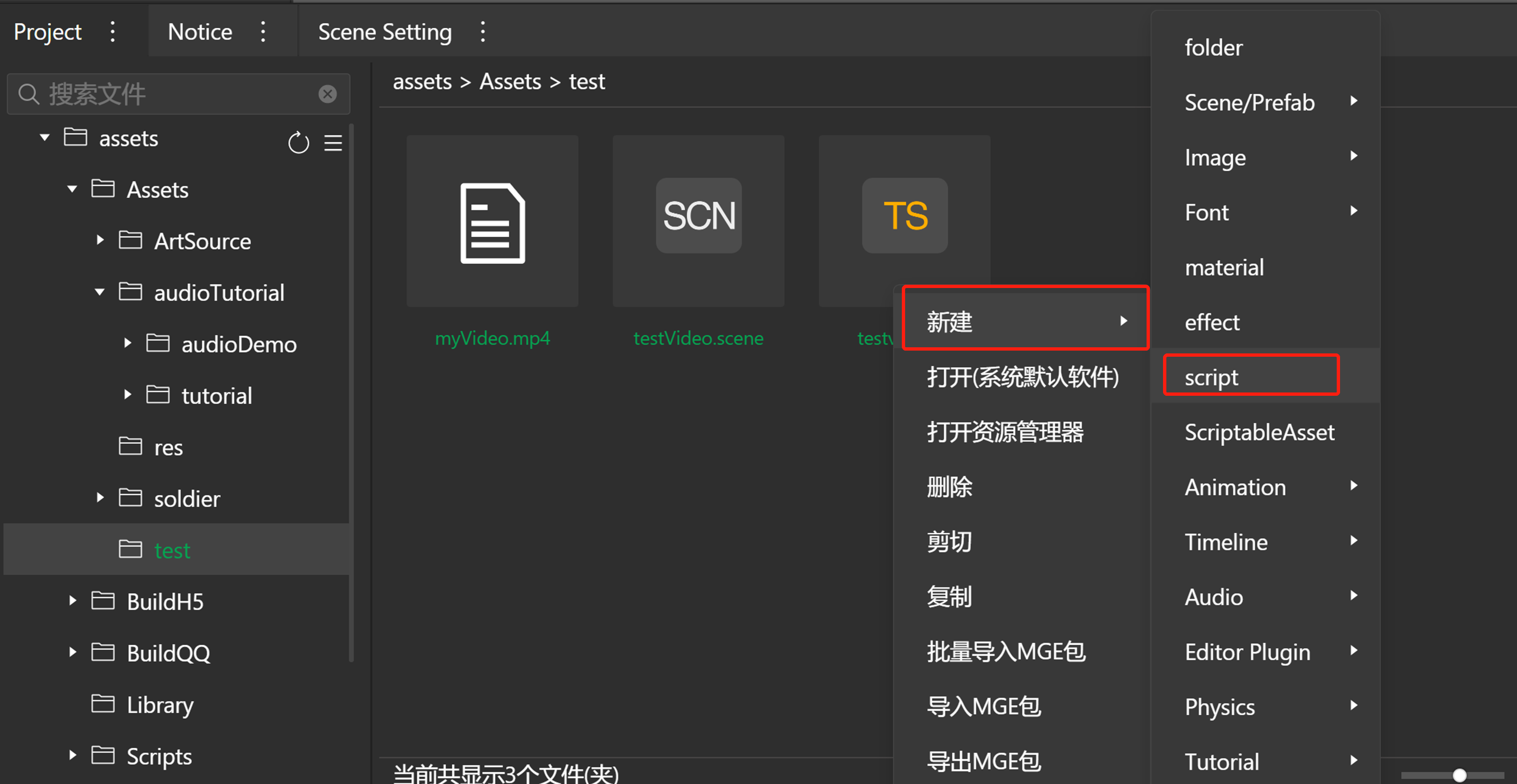 - 在Project面板空白处右键菜单 “新建” -> script,创建脚本文件,并重命名为testvideo。
