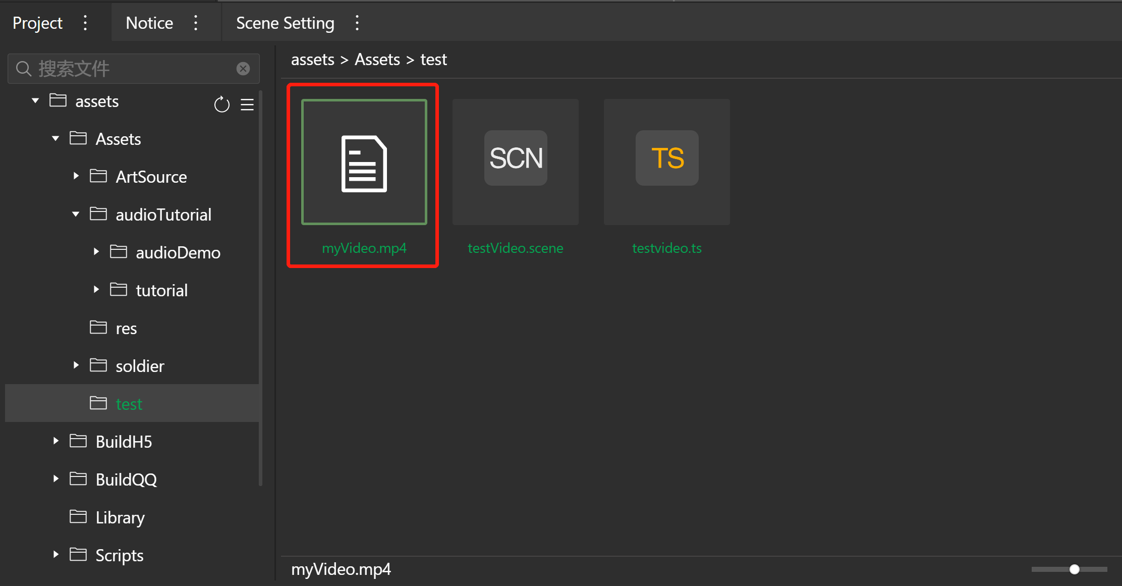 - 拖动视频文件到Project面板,即可导入视频文件,并自动生成可用于小程序项目的视频资源。