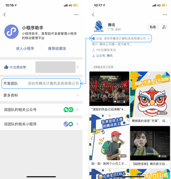 小程序主体信息可通过小程序资料页-开发团队进行查询,视频号主体信息可通过视频号首页-认证进行查询。