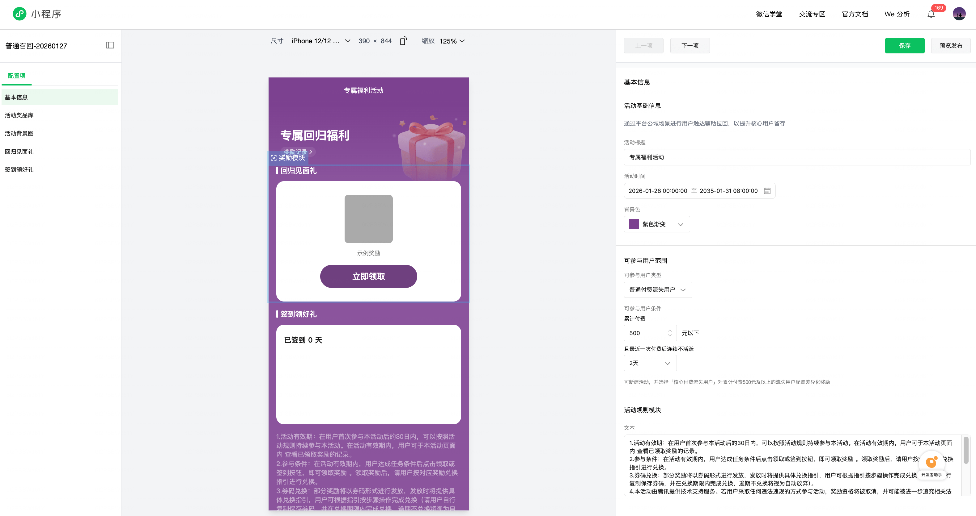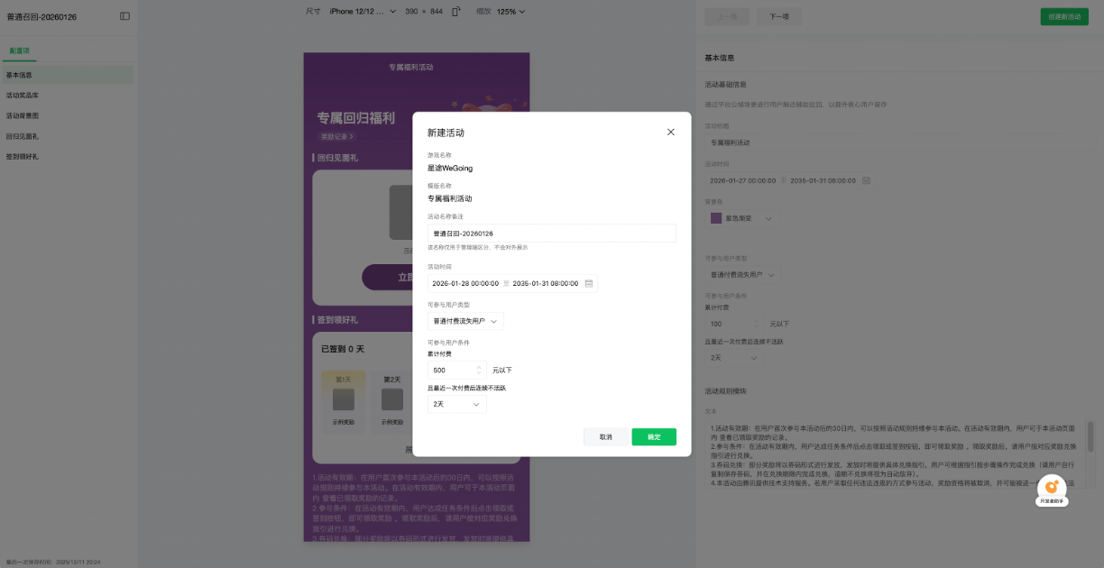 | 1 | 新建活动 ● 活动名称备注:用于区分活动,C端不外显 ● 活动时间:建议时间足够长 ● 可参与用户类型:结合游戏需求,对所选标签用户进行定义 (以示意图为例:活动面向「普通付费流失用户」定向触发,仅累计付费500元以下,且最近一次付费后,连续2天不活跃的用户可见) | |