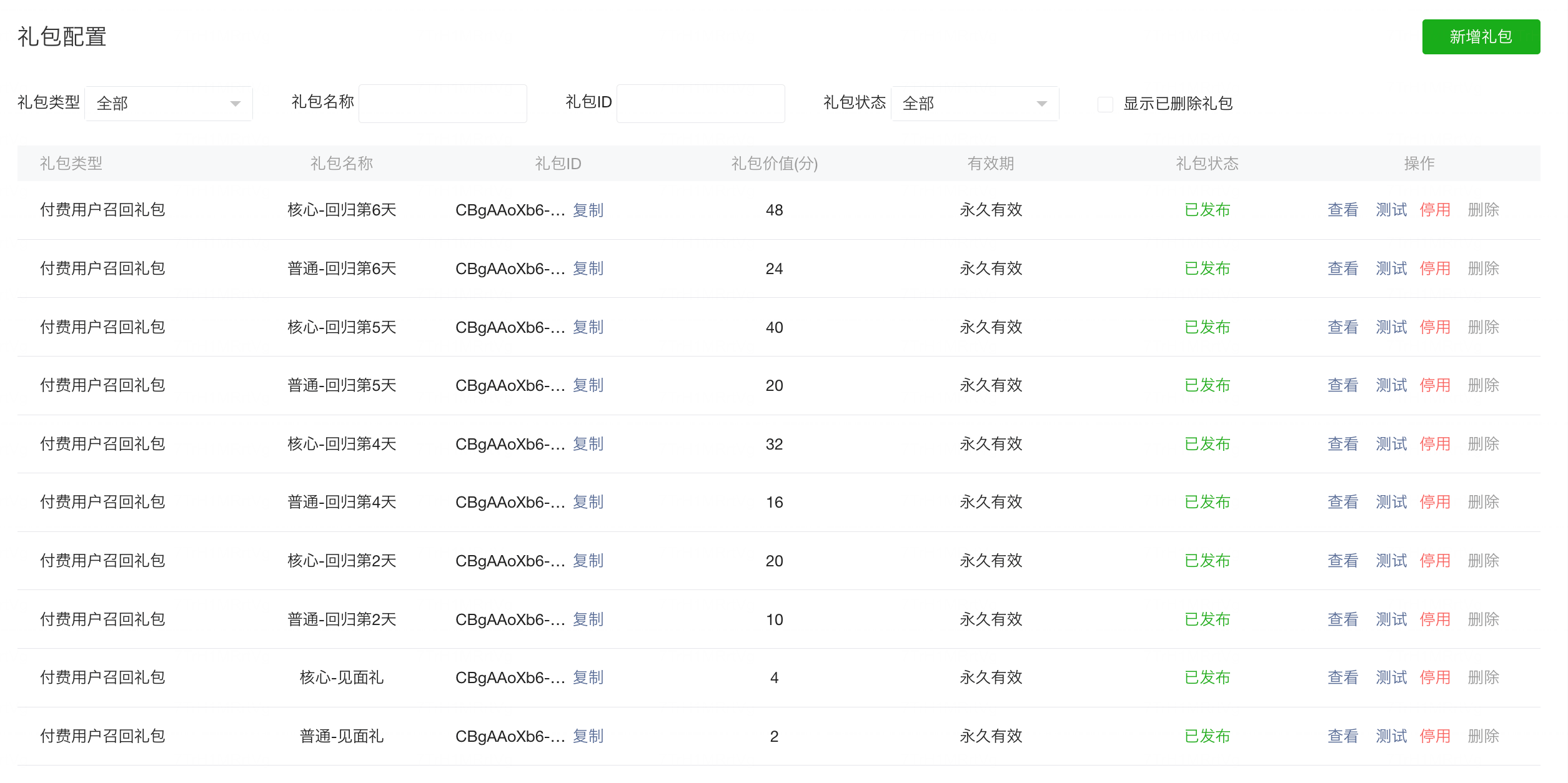 | 2 | 发布礼包 新建礼包后,完成礼包「测试」与「发布」 |
