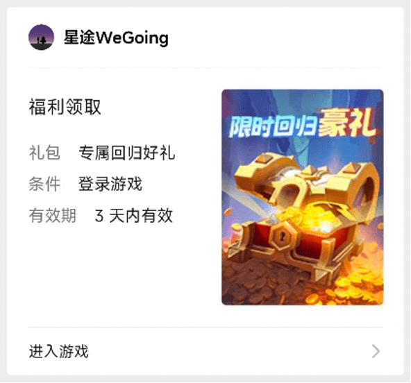 推送入口:目标用户收到回流活动推送,点击推送拉起游戏,参与活动