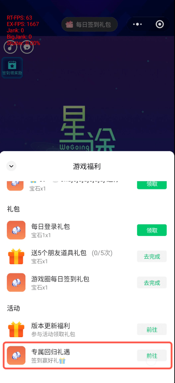 回归见面礼:一次性奖励,登录游戏可领取;奖励类型为小游戏礼包
