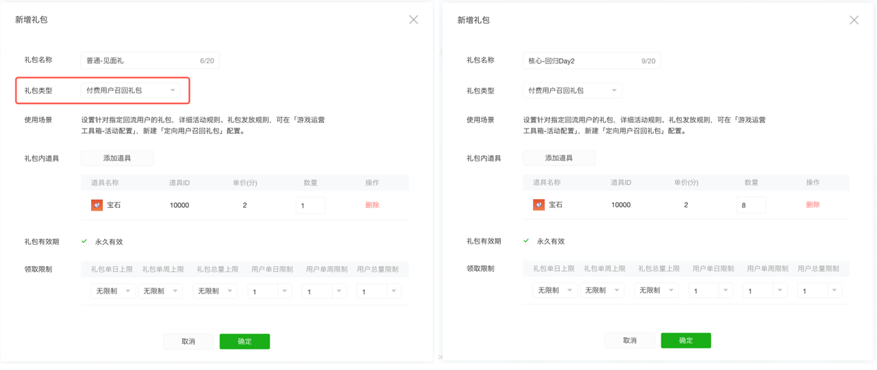 | 1 | 新建礼包 ● 礼包类型:付费用户召回礼包 ● 回归见面礼:2个礼包;用于普通付费流失用户、核心付费流失用户的回归登录奖励 ● 签到领好礼:8个礼包;用于普通付费流失用户、核心付费流失用户的第2、4、5、6天签到奖励 | |