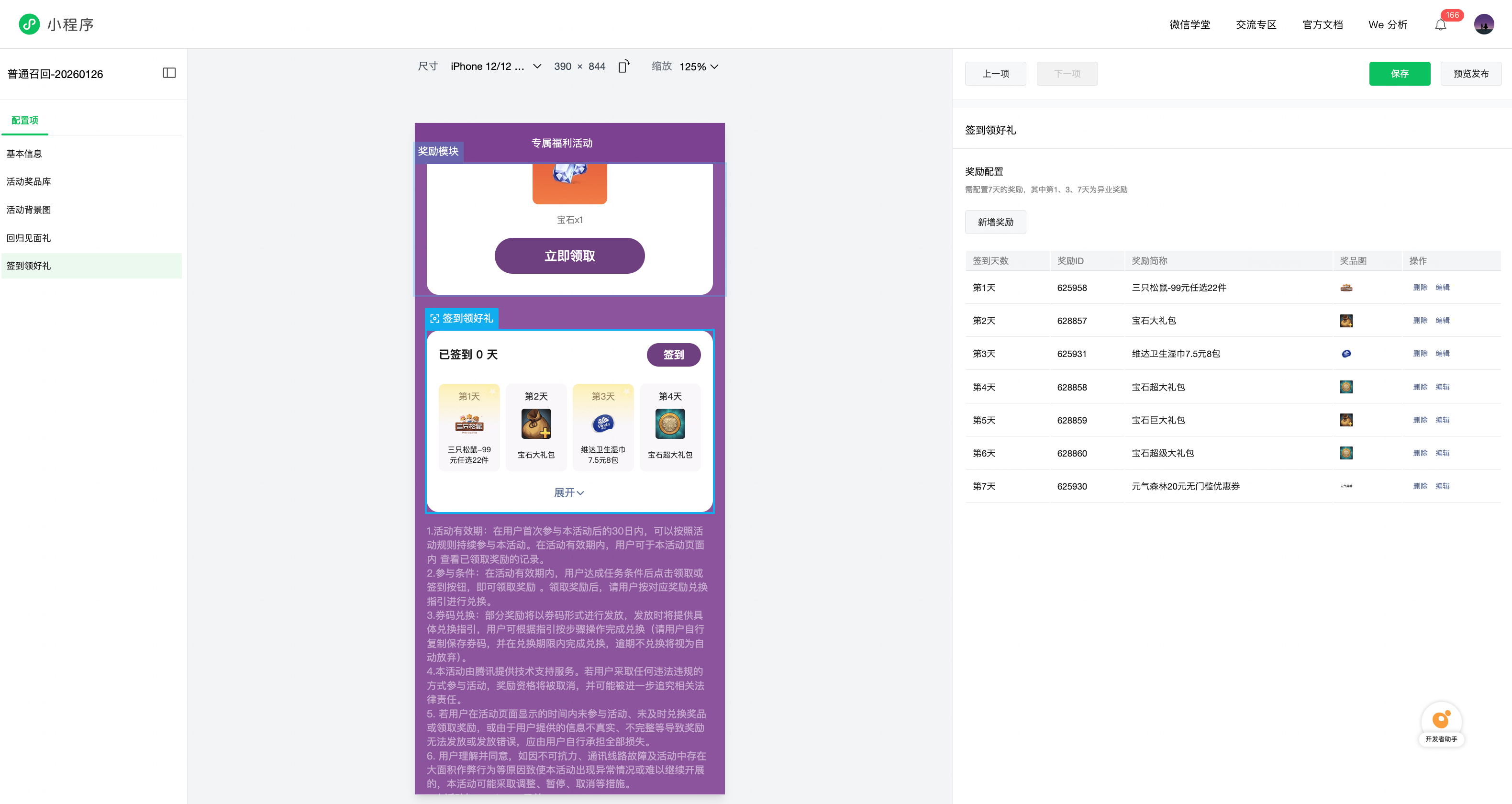 | 6 | 签到领好礼配置 ● 点击[新增一条] ● 第1、3、7天:配置异业奖励(下拉选择即可) ● 第2、4、5、6天:配置小游戏礼包。下拉选择对应礼包,配置礼包名称、礼包icon(C端外显) ● 配置完成后,点击右上角[保存],预览整体效果 ● 确认后,点击右上角[预览发布] | |