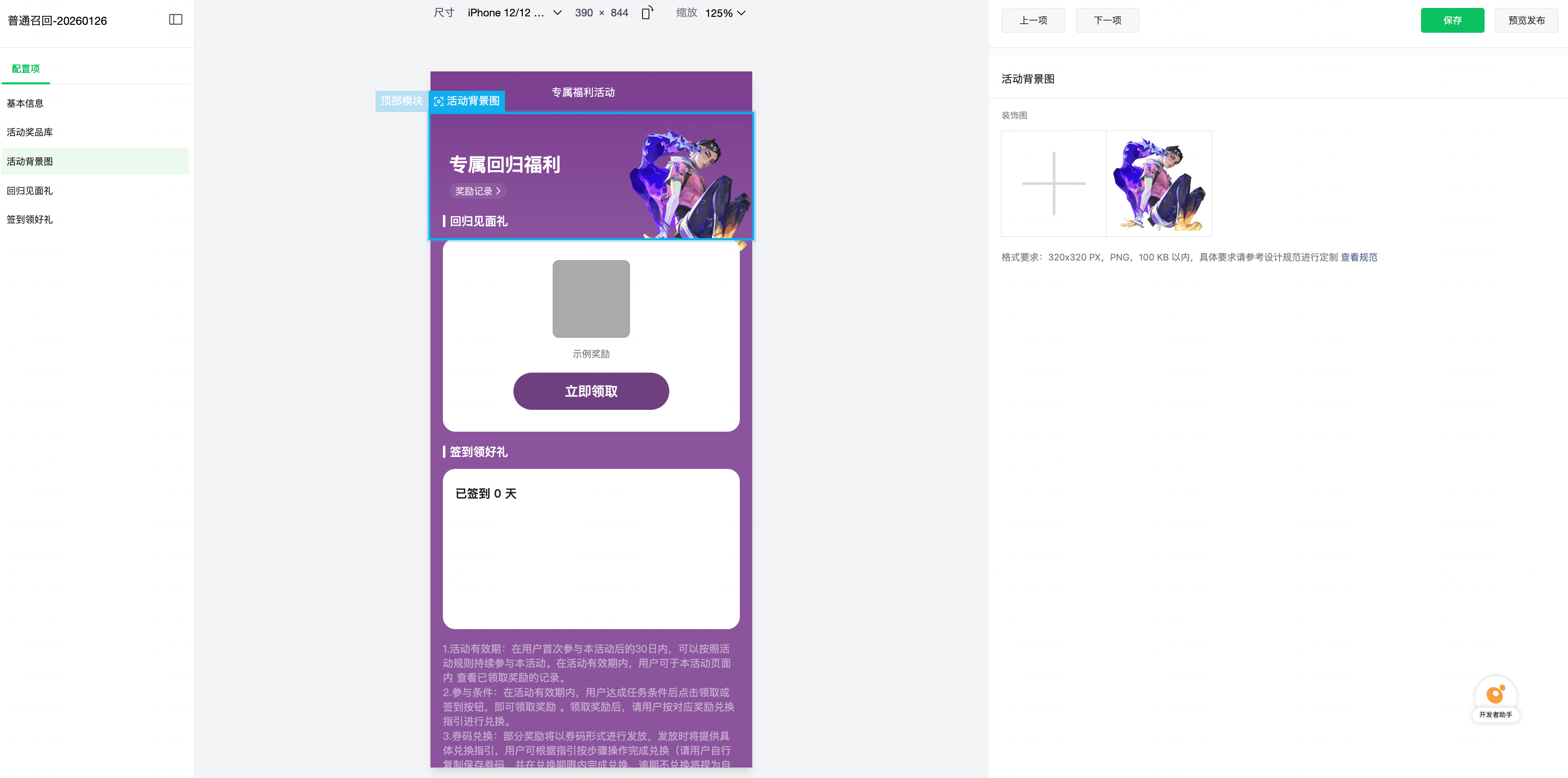 | 4 | 活动背景图配置 ● 建议删除默认背景图,参考设计规范,上传与游戏风格契合的背景图(C端外显) ● 上传成功后,点击右上角[下一项] | |