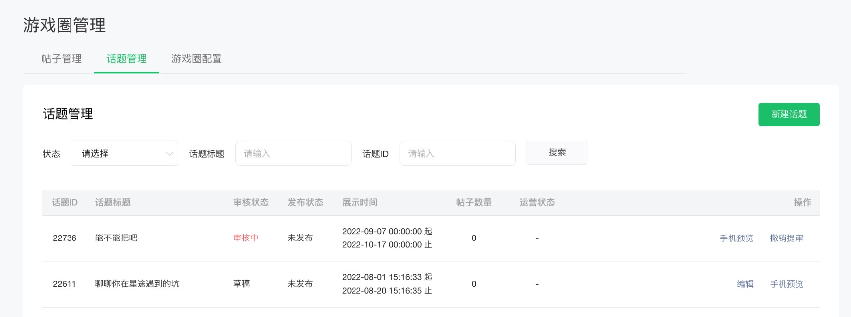 话题管理:新建话题、推荐话题、导入帖子、查看话题下的帖子、创建话题任务及奖励
