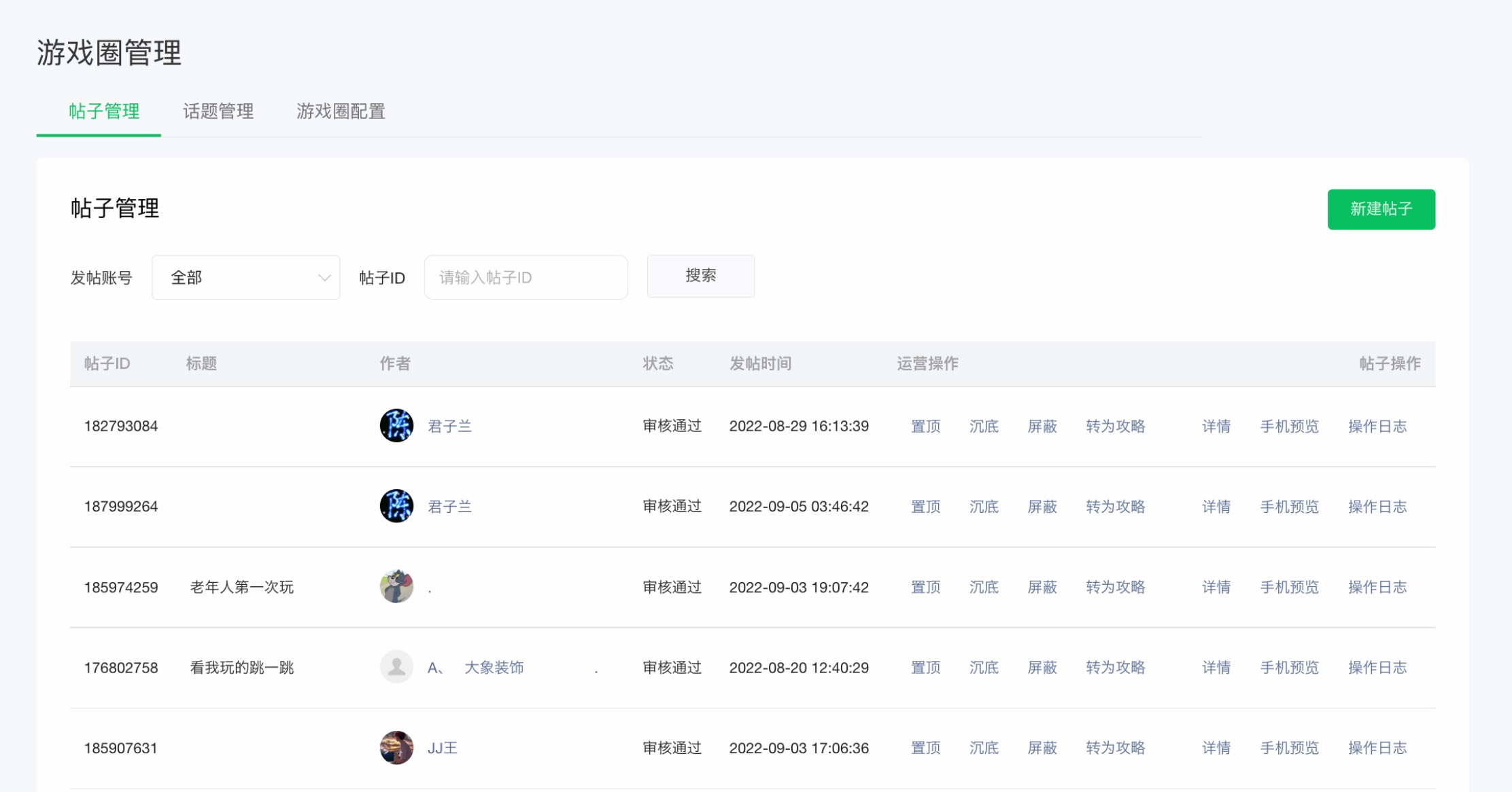 帖子管理:用官号发帖;所有帖子的管理(置顶、沉底、屏蔽、转为攻略);个人管理(帖子、评论批量沉底、屏蔽)