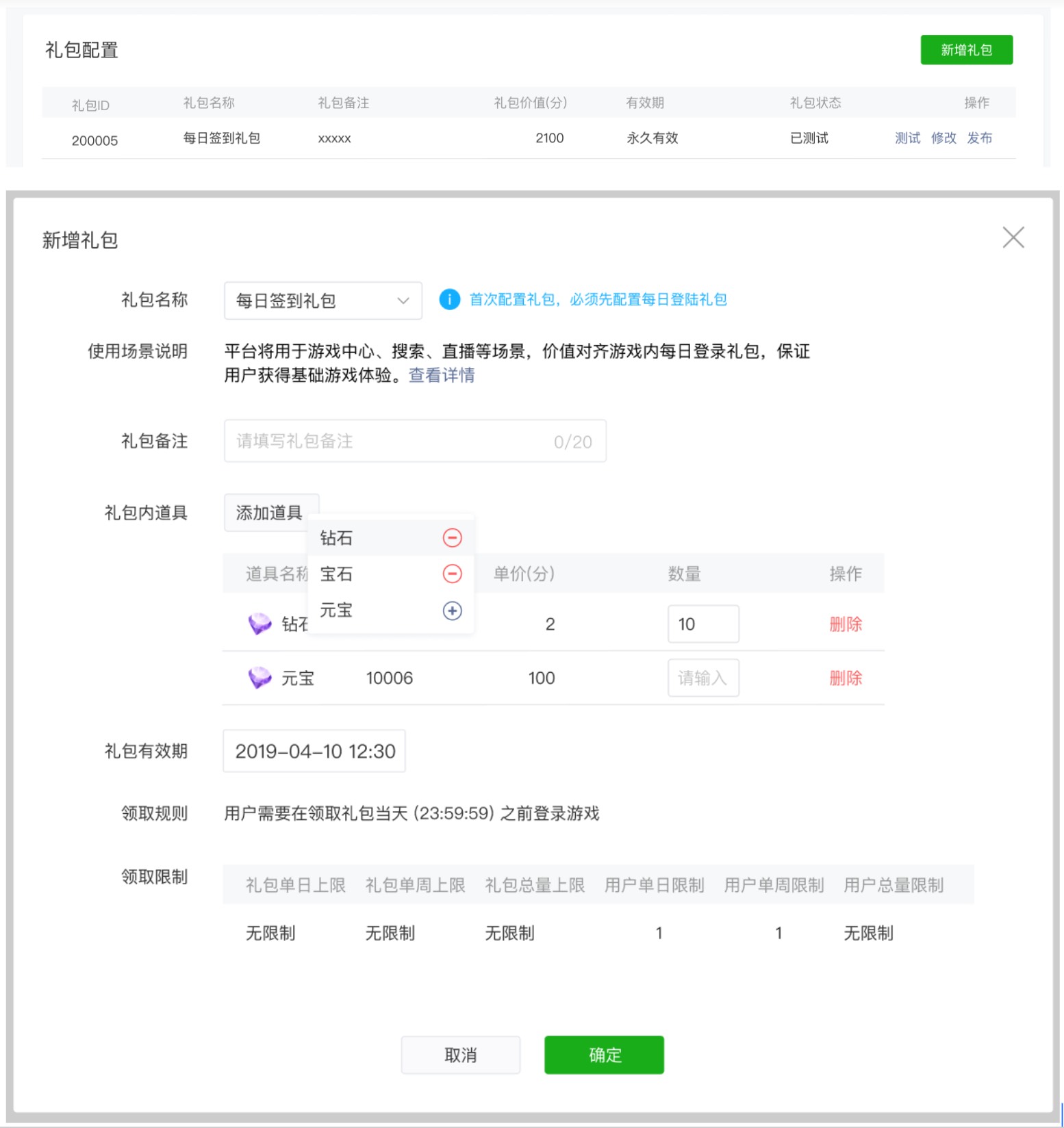 - 开发者可在「MP 后台-功能-运营功能管理-游戏礼包道具」,添加游戏道具。