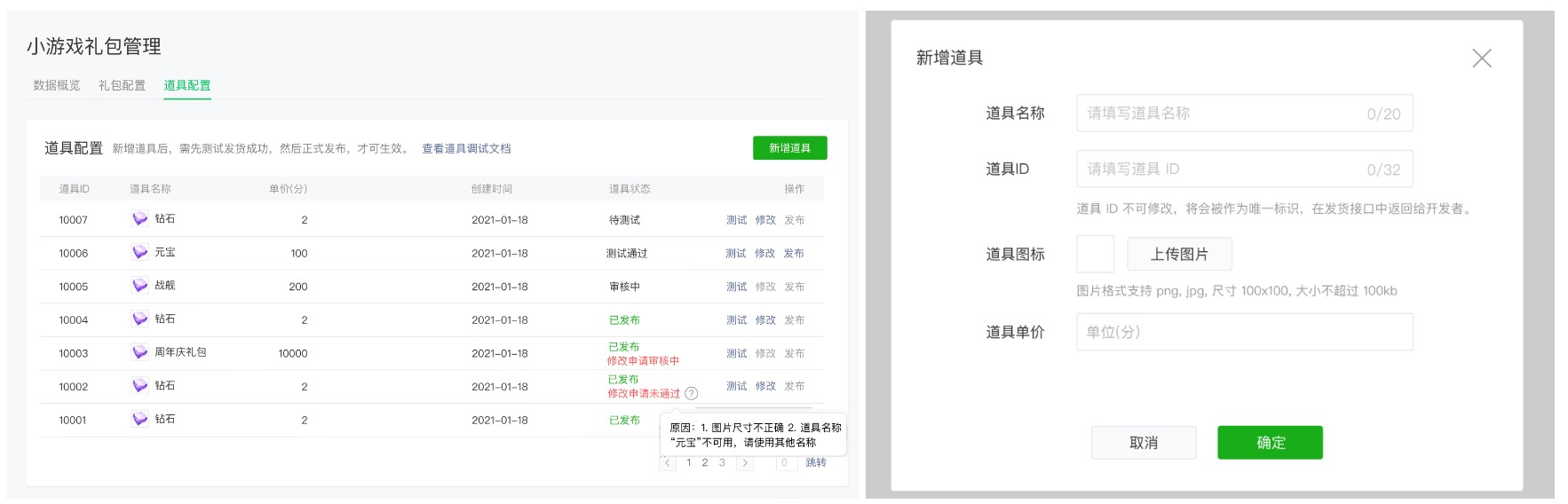 - 发布前,道具需要先在 MP 上发货成功及测试通过后才可以提交。提交后,平台会进行审核,审核通过后自动发布。发布后才可配置礼包。审核需要 3-7 工作日。
