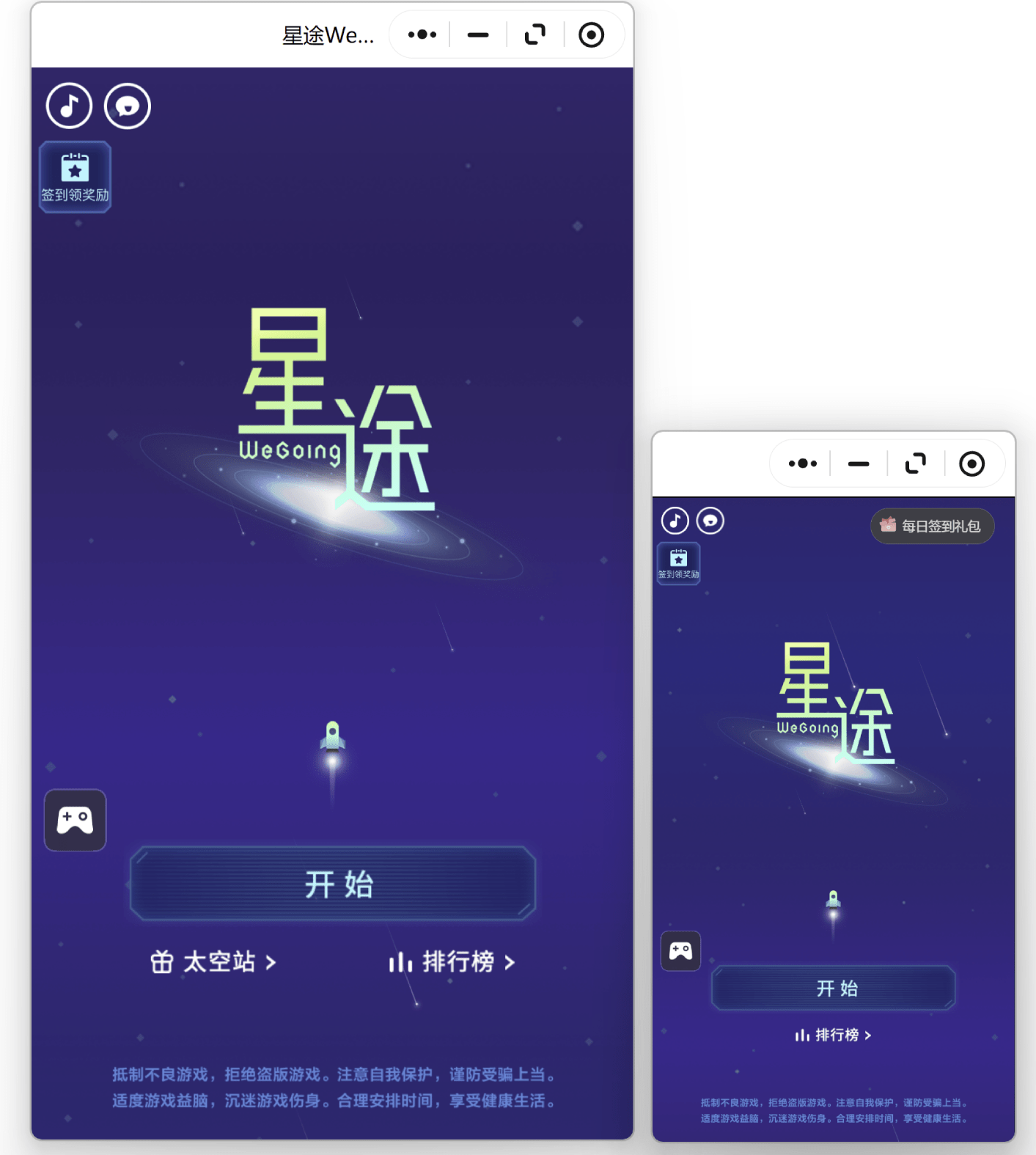 PC小游戏支持比移动端更大更清晰的画面。用户在进行窗口缩放时,将会等比例拉伸游戏的画布尺寸,从而影响到游戏素材的视觉表现和实际交互。因此,开发者可以根据游戏在PC上的实际呈现,对UI布局进行对应的动态调整,避免出现UI错位、消失,按键无法点击等影响用户体验的情况。 同时,平台建议开发者能够提供更符合PC端游戏习惯的界面体验,下列部分常见案例供参考: