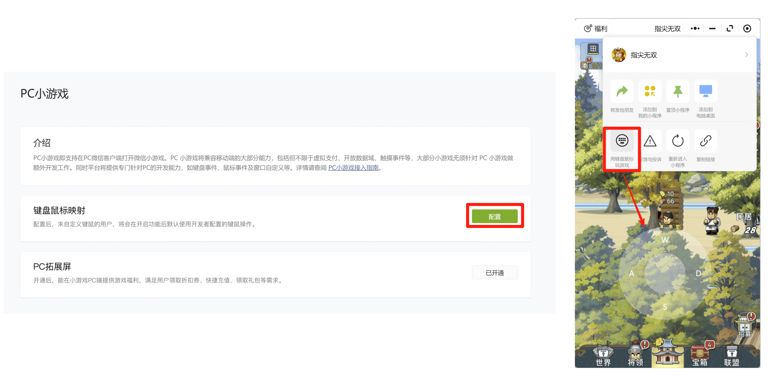 功能设置入口位于:登陆「小游戏MP后台」-> 左侧菜单「PC小游戏」->「键盘鼠标映射」。