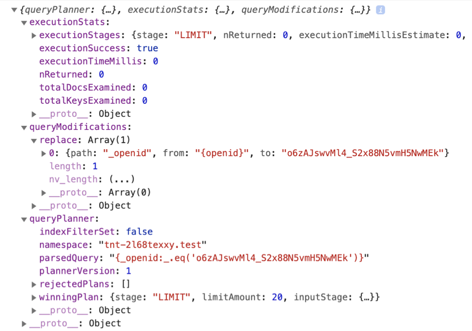 数据库 Explain API 是帮助开发者分析查询语句的 API,它的使用方法也很简单,在需要进行查询语句分析的数据库 API 入参中传入 explain: true,则 API 的返回值会变成该查询的分析结果,包括查询语句的执行计划、执行情况(包括索引使用情况)、及系统层面对查询语句的修改。为防止误操作,该 API 仅会在开发者工具中生效。简要示例: