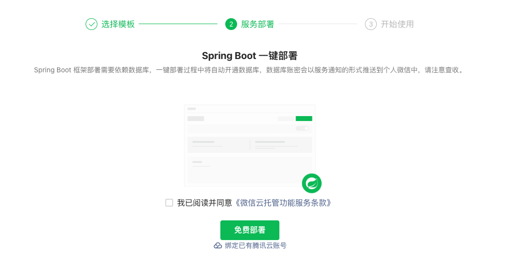 - 重新开通微信云托管,此次注意选择「绑定已有腾讯云账号」。
