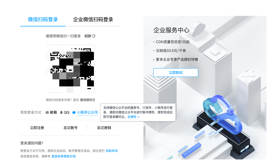**不支持多个小程序/公众号/第三方服务商/小游戏/小商店绑定同一个腾讯云账号。同主体请使用 资源复用.
