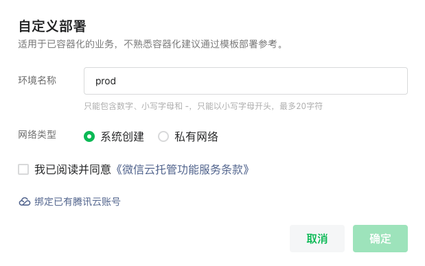 请在首个环境创建时,选择“绑定已有腾讯云账号”。