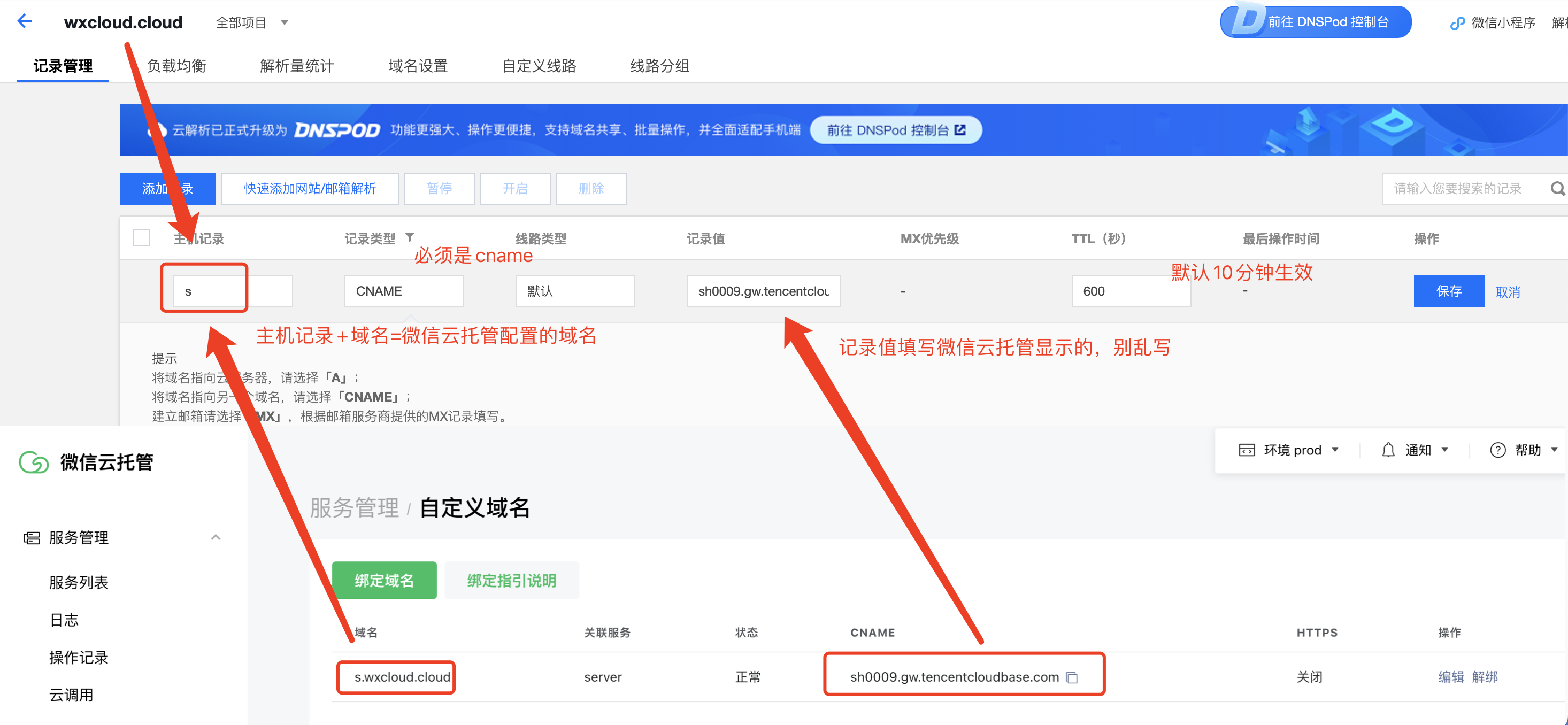 绑定自定义域名后,域名列表中会返回CNAME信息;可前往 DNS 服务提供商(如 DNSPod)添加 CNAME 记录,将域名指向微信云托管返回的服务 CNAME 域名;如在DNSPod中配置,可查看CNAME 配置指引
