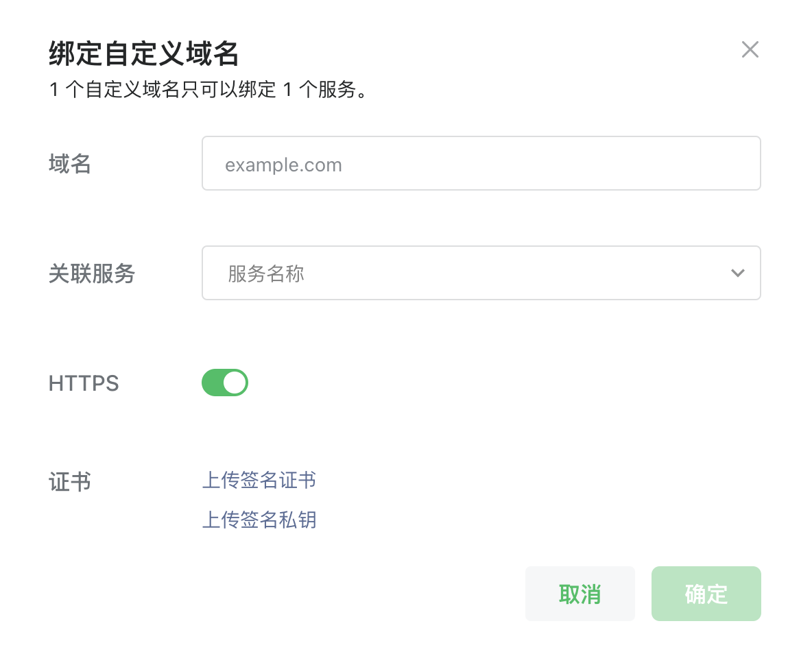 2. 除小程序/公众号之外,服务还额外需要对外提供api,因为默认公网域名仅可做测试之用,线上生产需要绑定自定义域名,1个自定义域名对应1个服务,1个服务可以对应多个自定义域名