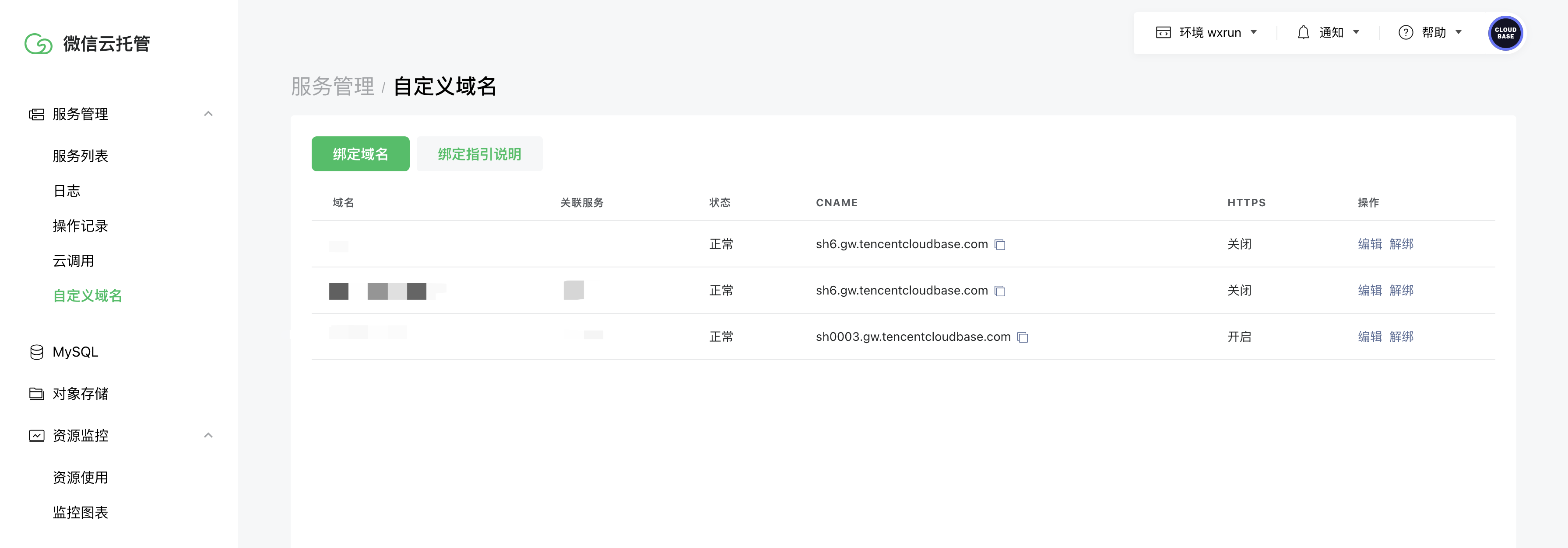 点击「确定」,即可将自定义域名绑定到目标服务上,并在列表中生成一条绑定信息,提供「编辑」及「解绑」能力。