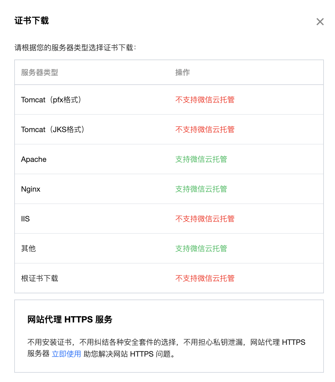 推荐选择 nginx 证书,各证书支持情况如下: