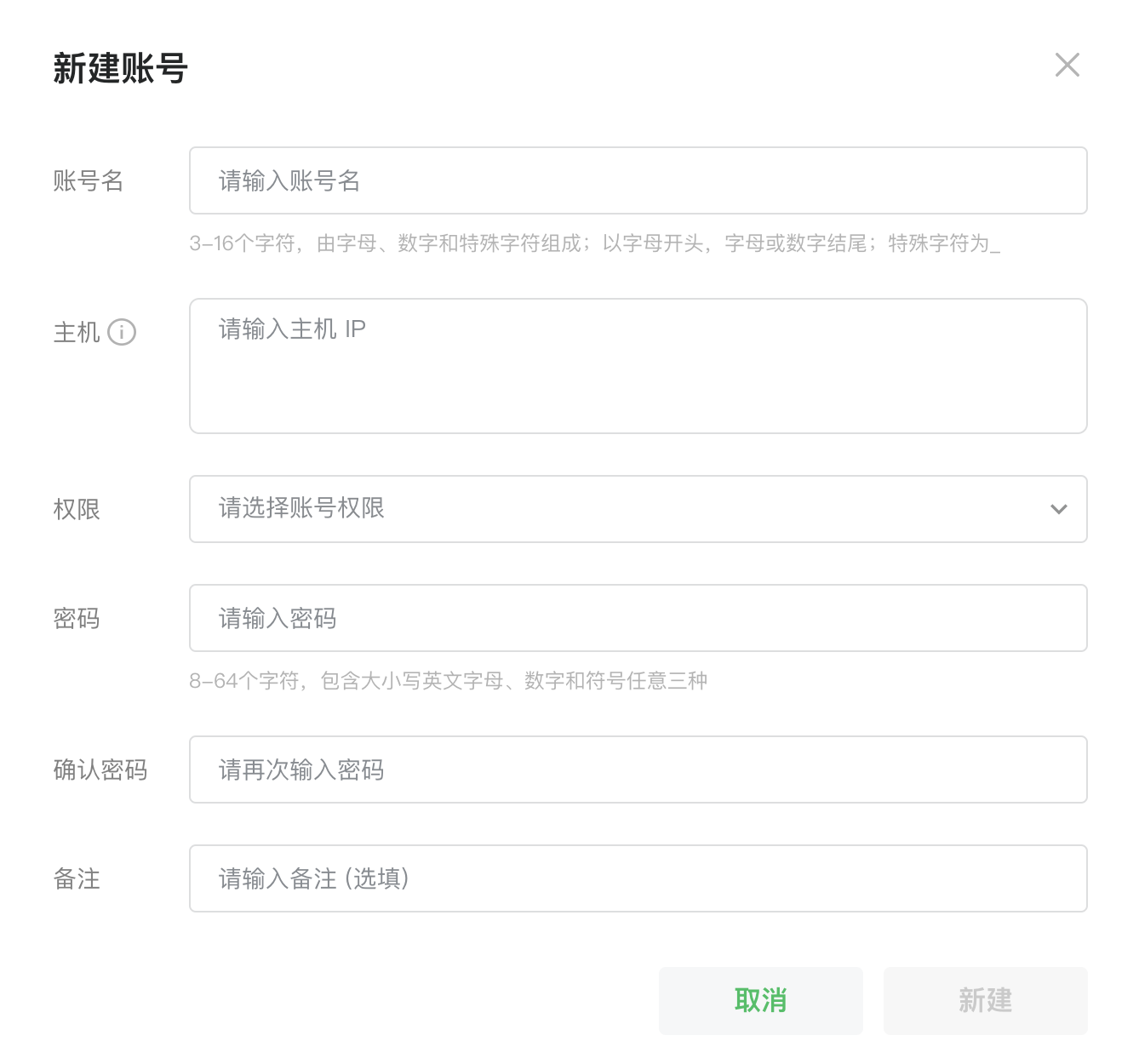 开通成功后,进入数据库账号管理及数据库信息页面,点击「新建账号」,弹窗显示需配置内容;
