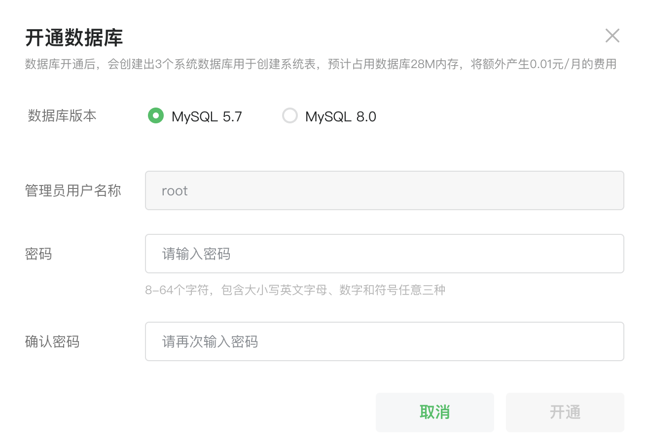 输入数据库密码后,点击「确定」即可开通使用MySQL数据库;