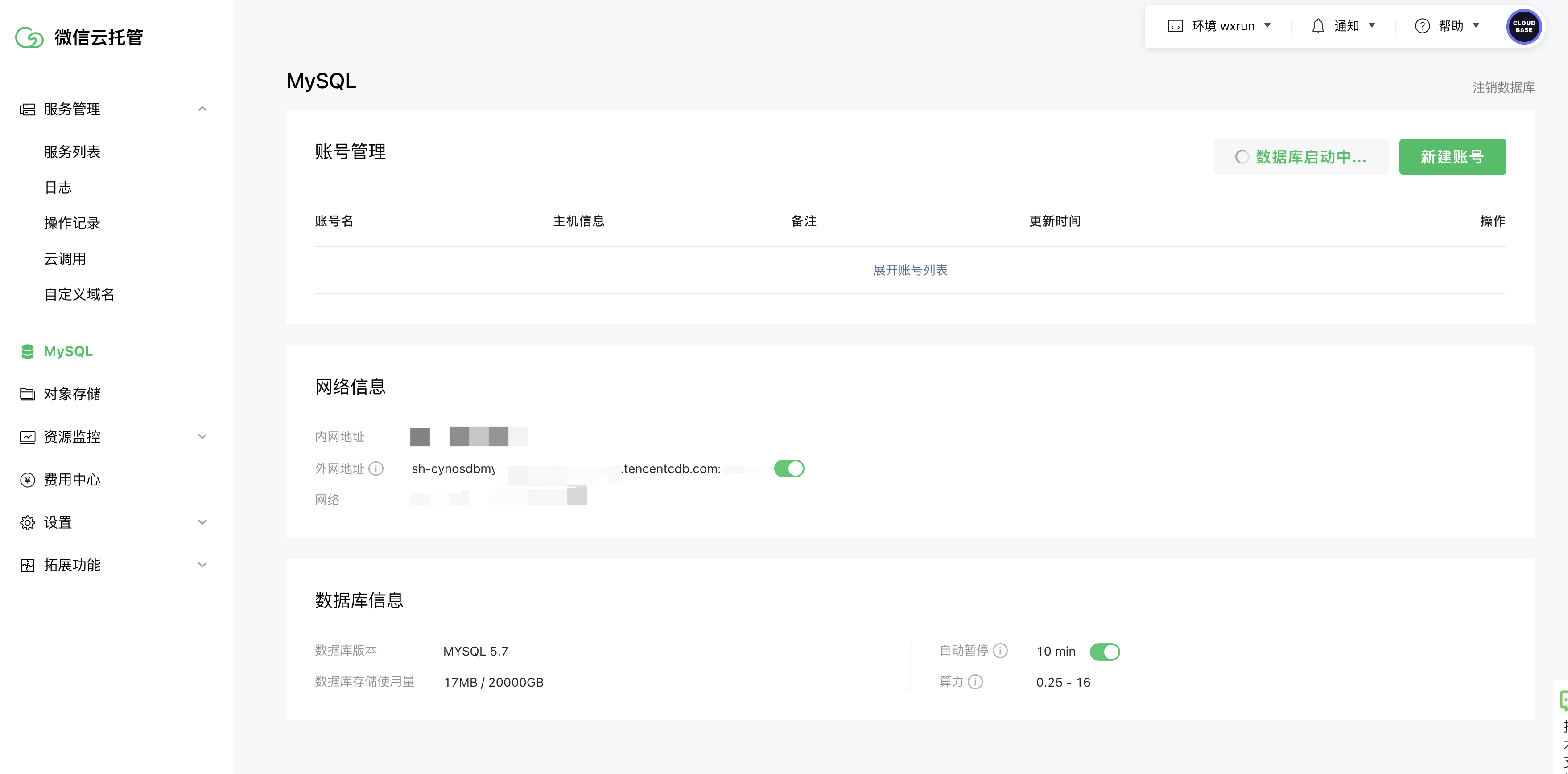 • 外网地址:可在外网通过该外网地址访问当前数据库。开放数据库外网地址有安全风险,不建议开启。请自行评估风险,微信云托管对此不提供保障与赔偿。