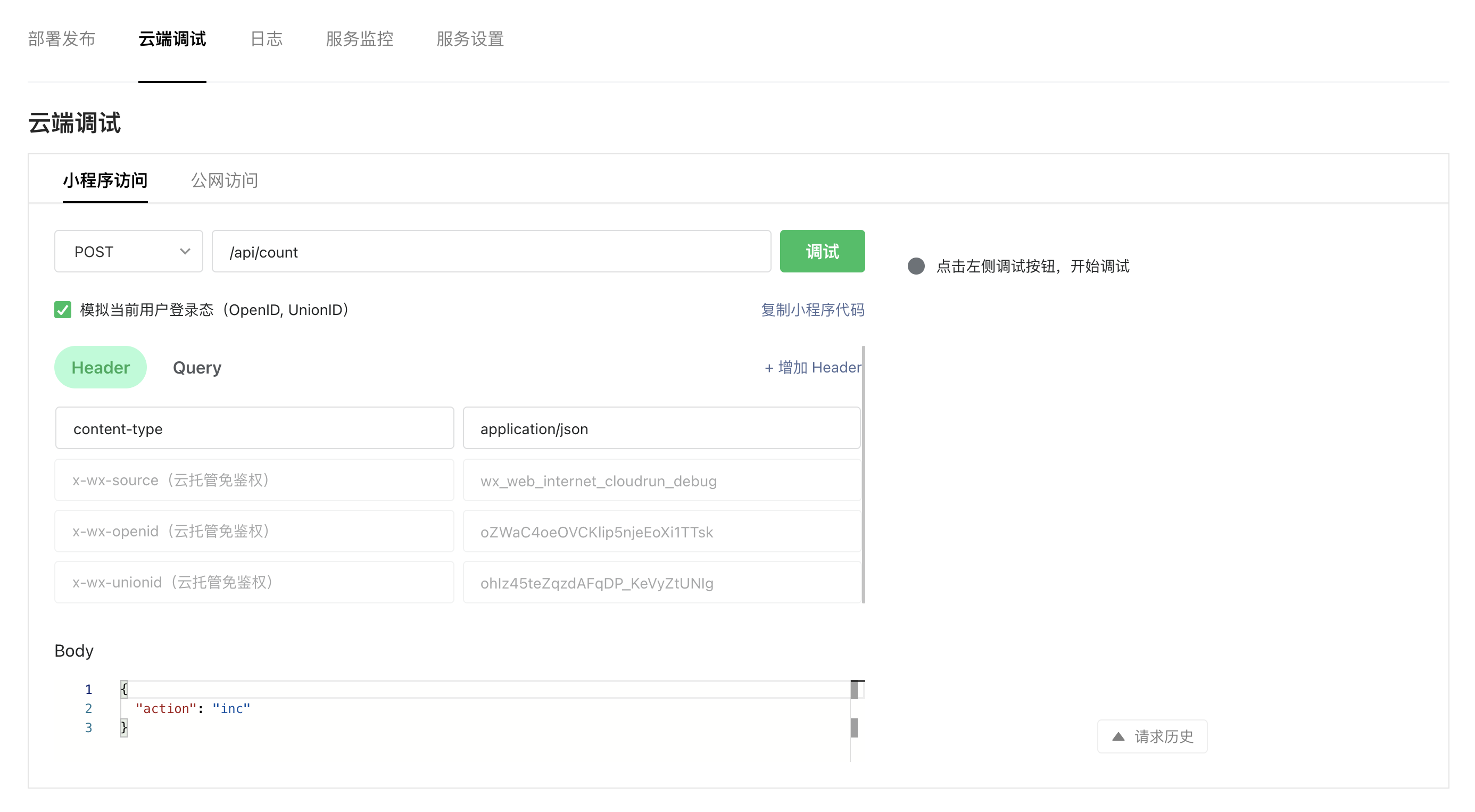 服务控制台「云端调试」可以很方便的模拟请求向服务的线上版本发起调用,从而测试服务的可用性。