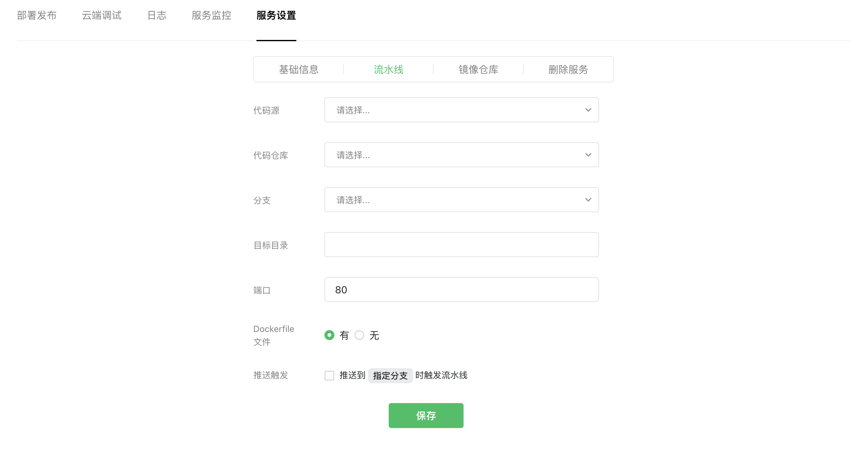服务设置主要管理服务的整个运作,包括配置服务部署的规格,流水线,镜像仓库,以及服务的删除。