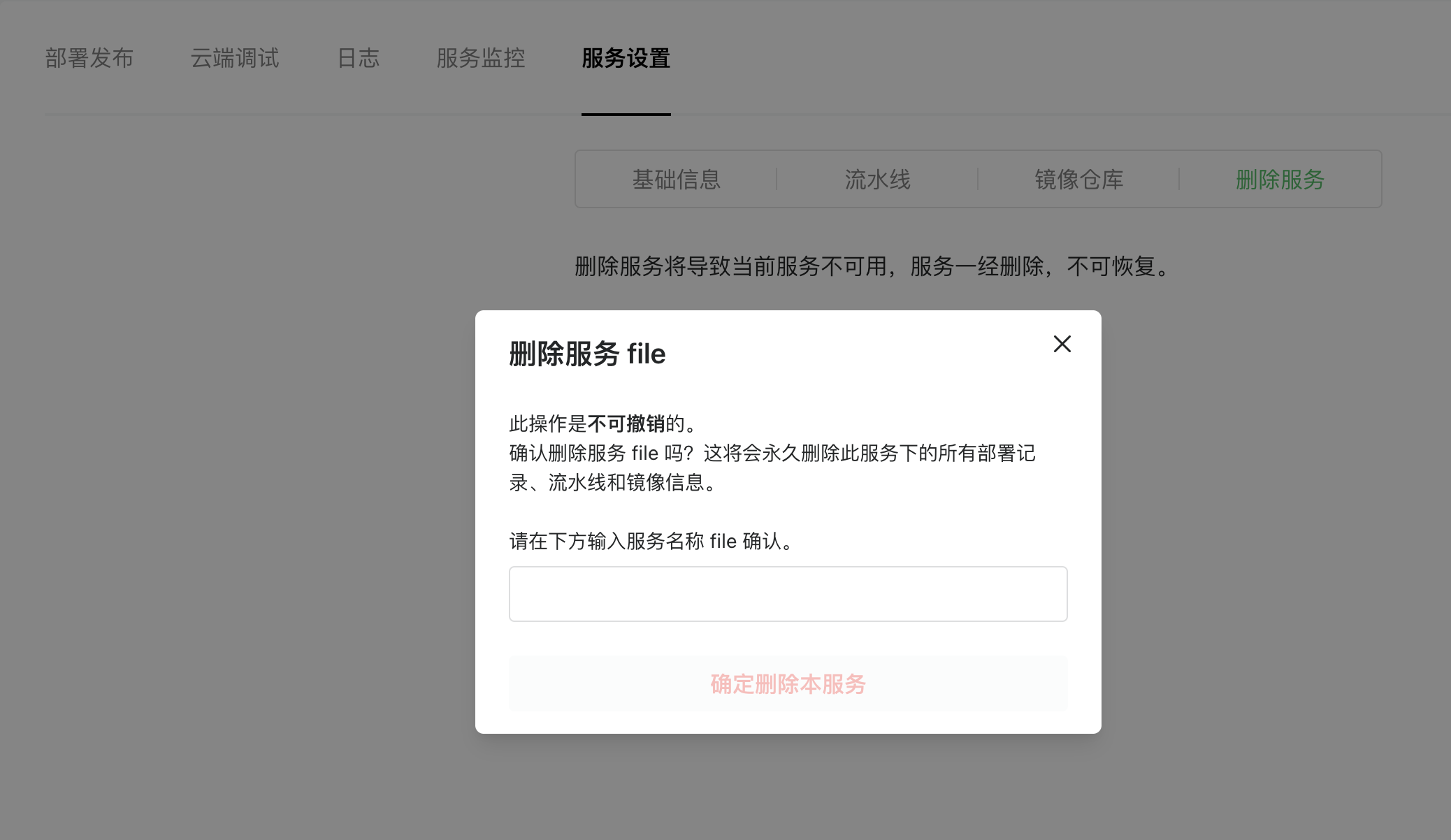 删除时会永久删除此服务下的所有部署记录、流水线和镜像信息,需要填写「服务名称」二次确认。