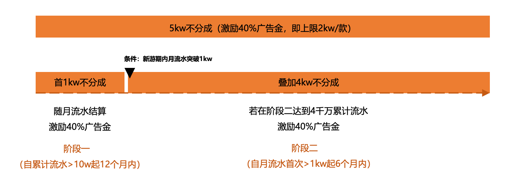 【阶段一】:首发游戏于累计流水>10万的12个月内为新游期。在新游期内,0~1千万累计流水期间,40%激励金随月流水结算。若期间判定为非首发,则从该月起不享受首发新游激励,已结算月份不影响;