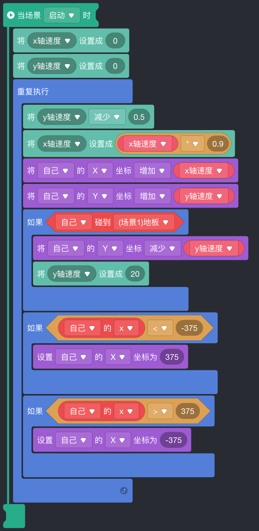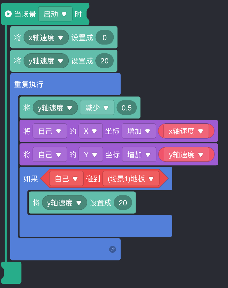 可以尝试按照如下图添加积木,在游戏开始时角色便会向上跳起并落下,碰到地板后又弹起