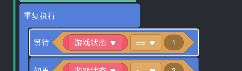 使用【等待条件】积木,当我们进行帧循环时,部分控制角色移动或者敌人移动的事件必须经过【等待是否在游戏进行中】才能执行