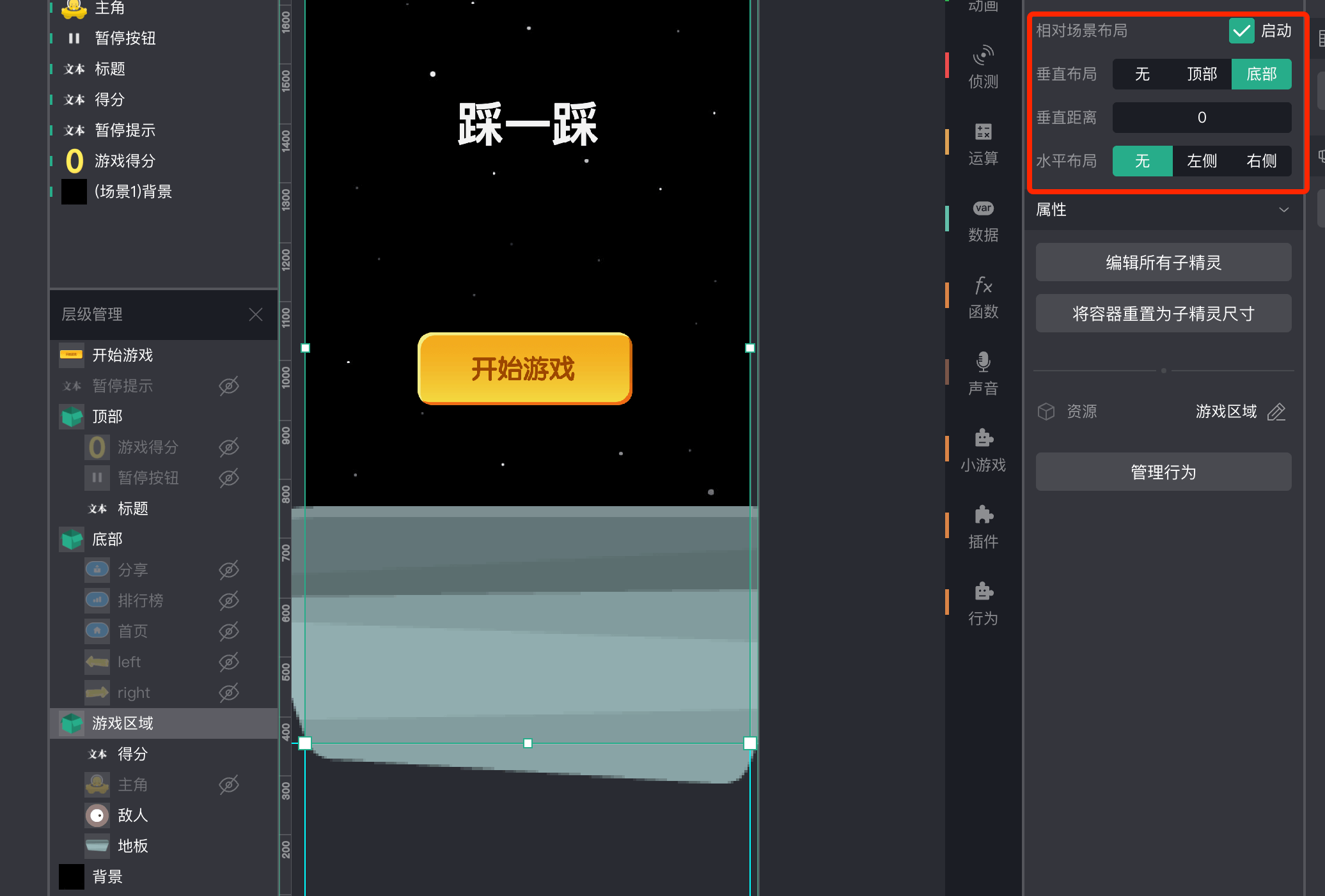 以及游戏区域,我们希望平台是在不同屏幕下都是完好的不会露馅,那么我们就把游戏区域也设置为相对于底部布局