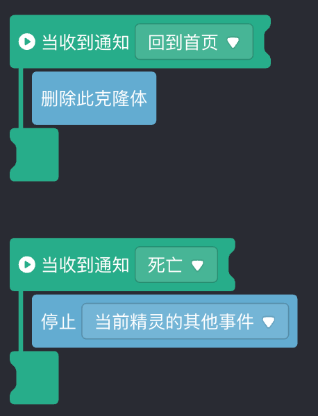 还有一个非常重要的积木【停止当前精灵的其他事件】,当我们收到游戏结束之类的通知时,我们需要打断其他角色的操作,让画面停下来,这样才不会影响后续的逻辑以及带来不必要的触发事件