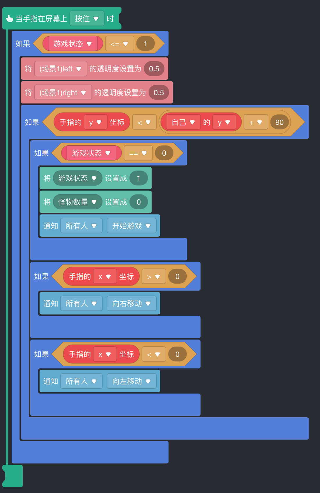 我们之前在底部 UI 添加了左右按钮来通知角色移动,但是往往这样的按钮区域是不够的,本示例选择通过判断手指在屏幕上按下时判断 x 轴来通知,这样操作的选区就会更大,具体积木在【底部】这个容器中