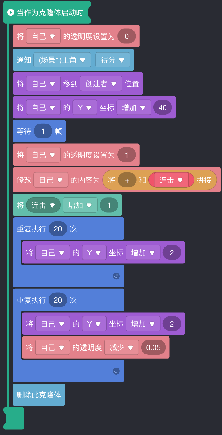 首先要移动到创建者位置,并调整 Y 值,让得分在怪物消失的上方出现,然后再把自己的文案改为对应的得分数,并循环增加 Y 轴坐标减少透明度来模拟向上渐隐的效果,最后还要记得删除克隆体