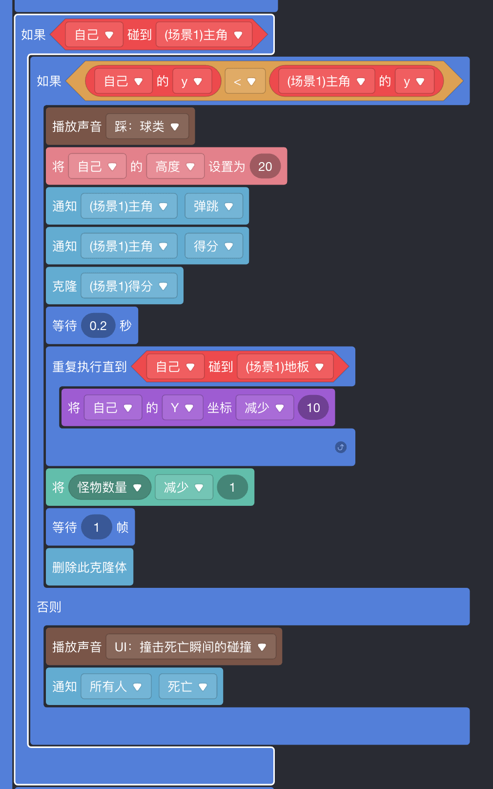 敌人在与主角进行碰撞时,会判断主角是在怪物的上方还是下方,这里也是本游戏的主要关键逻辑,这里当怪物被踩中时,就会减少怪物数量并通知主角得分和弹跳